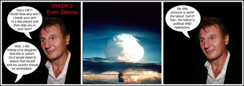 But enough about the philosophy of why bad movies are good. The two films we’re talking about here have merits. First and foremost, in both of these films, lots of people die for no good reason. Liam Neeson’s character is right to be upset about the kidnapping of his daughter, and he makes it clear that he feels justified in acting on those emotions. But his valuation of human life is bizarre, even by my standards. He just overreacts a tad. If normal revenge was being pushed into the pool fully-clothed, Taken is the tsunami in Japan. In both cases you get wet, but in the tsunami, you and everyone you know drown in a wall of mud, feces, and fire (all of which happens to be radioactive), even if you just met them. I heard they’re doing a sequel too: